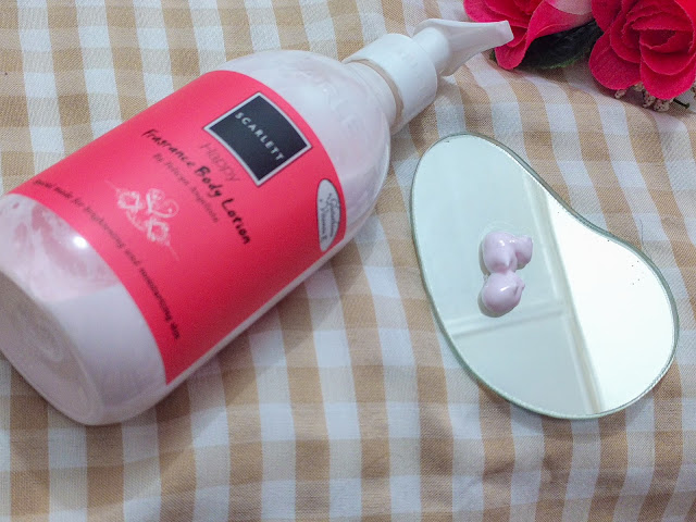 Scarlett body lotion Happy punya kandungan Glutathione, Vitamin E, Shea Butter, Aloe Vera Extract dan Titanium Dioxide. Manfaatnya antara lain membantu meratakan warna kulit, kulit jadi lebih sehat, lembab dan cerah berkat kandungan antioksidannya, merawat kekencangan dan elastisitas kulit, merawat keremajaan kulit, kulit terasa lebih kencang, menyejukkan kulit yang terkena iritasi ringan dan melindungi kulit dari efek buruk sinar UV. Scarlett body lotion Happy teksturnya ringan dan gampang meresap ke kulit. Kadang juga suka aku pakai sebelum tidur karena scent-nya Floral-Amber-Musky dengan notes Orange Mandarin, Jasmine, Musk, Amber dan Vanilla yang wangi dan bikin tidur lebih nyenyak.