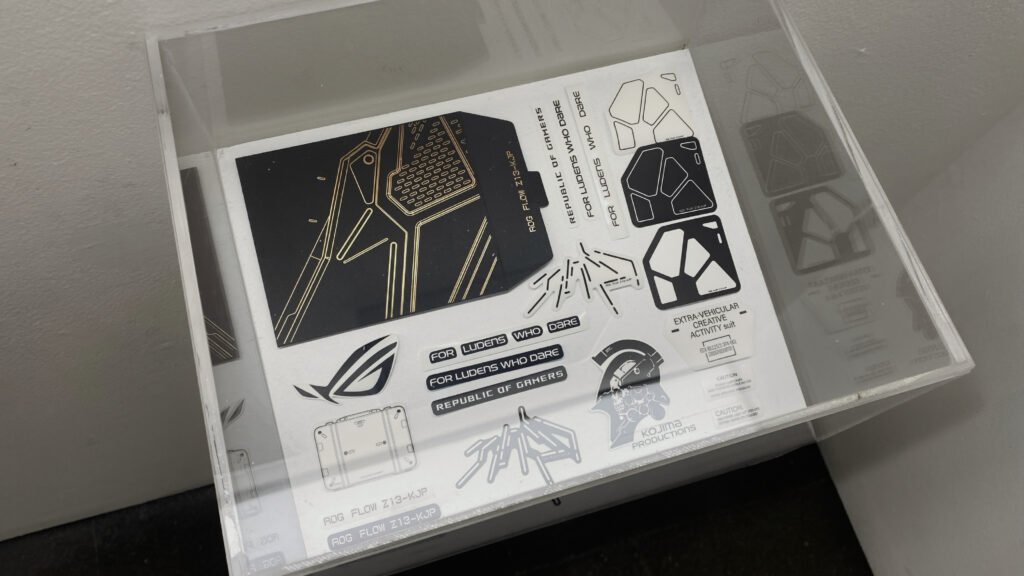 ROG Flow Z13-KJP terinspirasi dari estetika Ludens (maskot ikonik Kojima Productions), dirancang langsung oleh sang maestro Yoji Shinkawa. Detail bodinya punya estetika militer-futuristik dengan aksen Decennium Gold yang mewah banget.